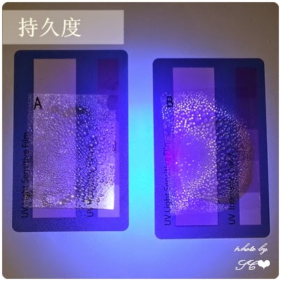 2. 然後將紫外線測試卡及膠片一同放置於紫外光燈下照射 15秒,立即拍照紀錄A、B透明膠片所覆蓋部分的顏色變化,並鑒定及比較 A、B兩支產品的防曬力,如紫外線測試卡顏色變化愈深,代表其產品抗紫外線能力愈低