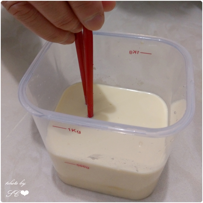步驟1: 加500亳升可飲用的室溫水和Hansells乳酪粉於乳酪瓶內,用一對筷子幫助攪拌,見母親大人眼明手快就像在打蛋一樣,轉幾圈乳酪粉便已全融了,果然是老手
