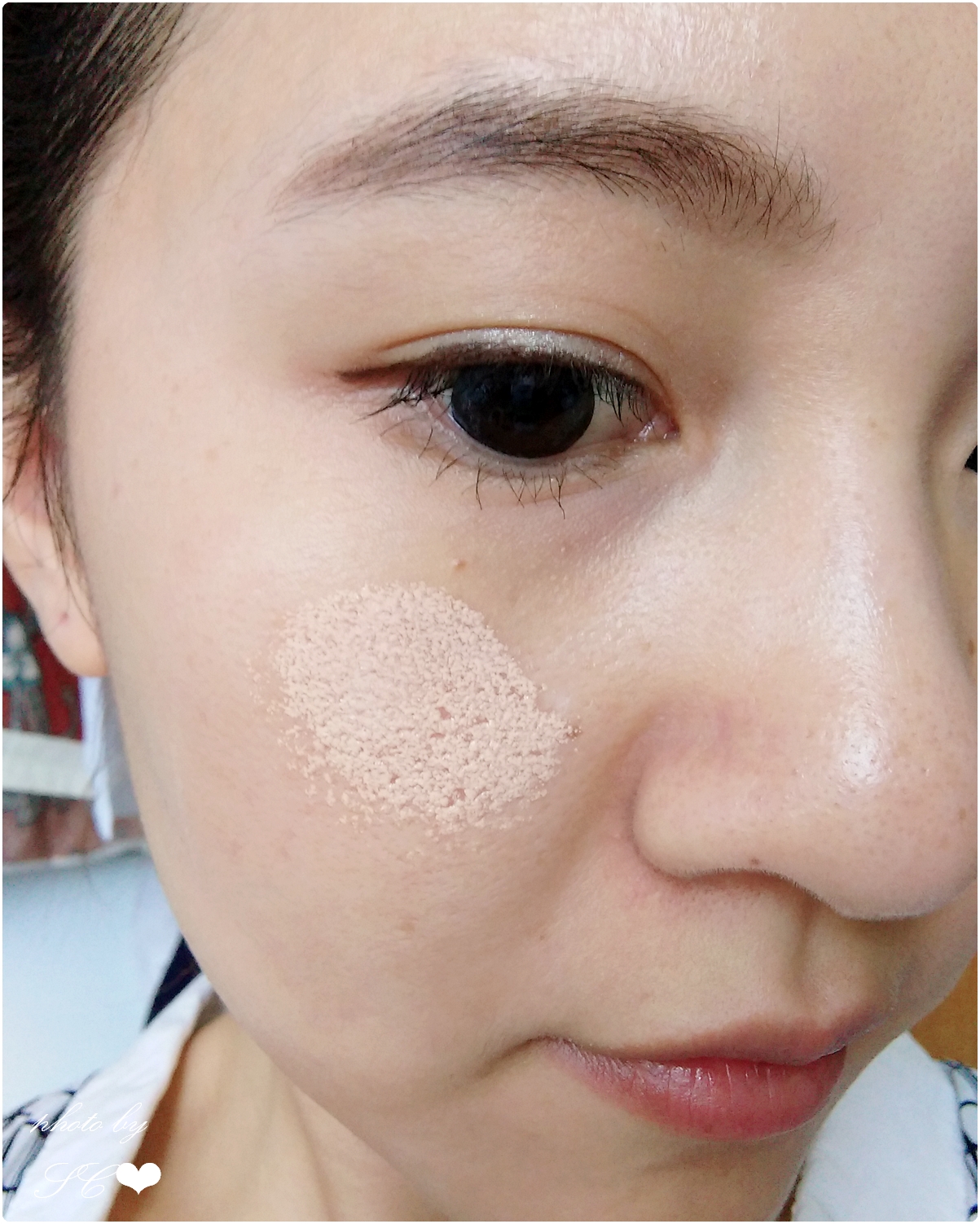 雖然平常是用自然色的,不過由於這款【控油水潤氣墊粉底】非常透薄,所以用淺一度的V201杏米色也不會過於死白,可以跟膚色很融洽混合
