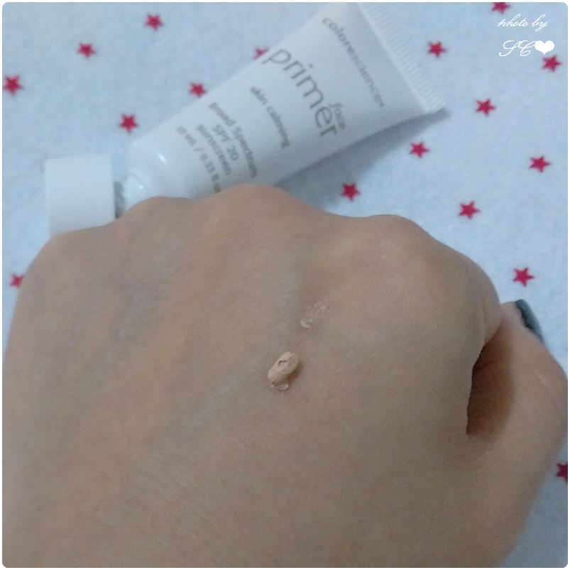 【鎮靜隔離霜】的質感還挺稠杰的,但是推開後就變得很輕薄,可以起到調節膚色的效果
