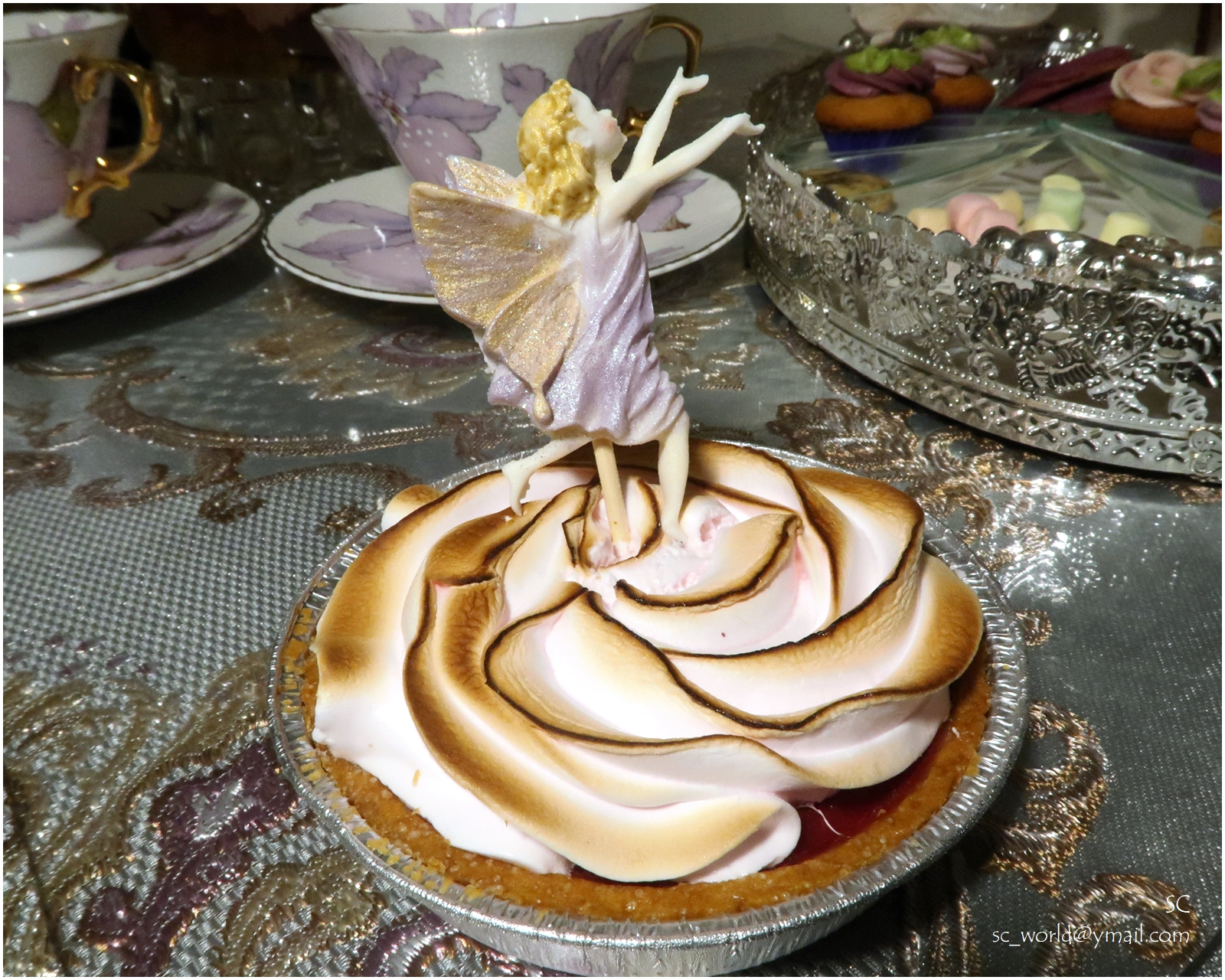 栩栩如生的翻糖花仙子精靈站在紅莓蛋白蛋糕上