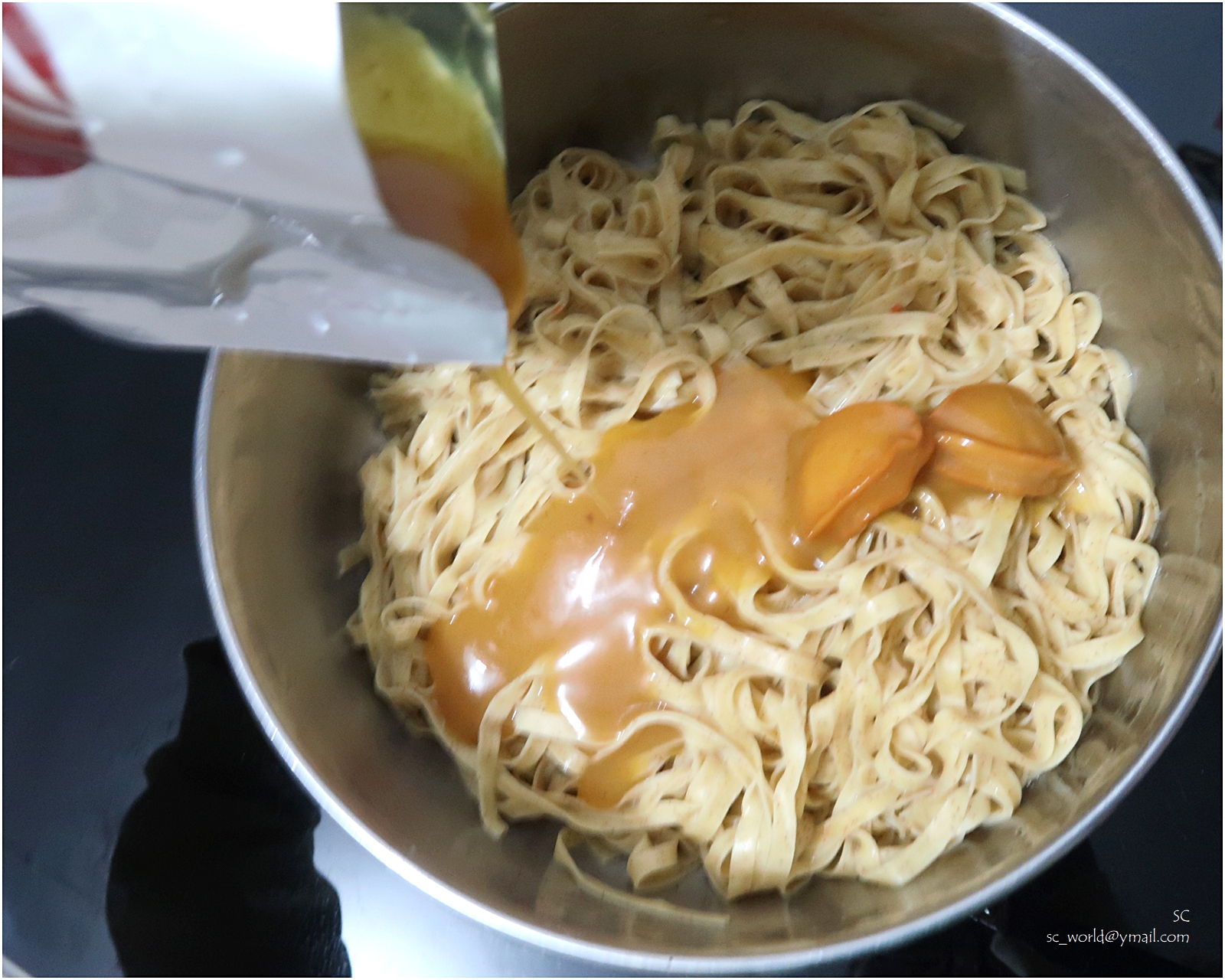 最後,把咖喱鮑魚湯汁倒在蝦子麵上就完成了