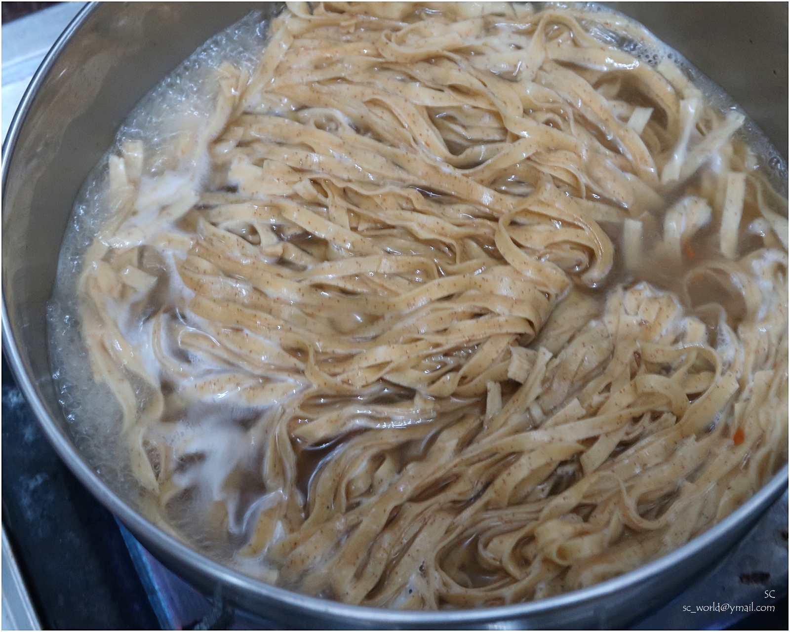 水滾後放麵,大約兩分鐘麵餅就會散開